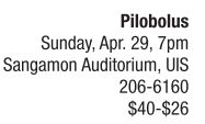 DANCE | Modern marvels Modern dance troop, Pilobolus turns Sangamon Auditorium, UIS upside down, and all around, with usual and spectacular movements Sunday, April 29. A work of art on twoand-twenty legs, this creative dance theatre captivates the world and will marvel you with their inventive, athletic and collaborative performance using the human body on stage as a medium for expression. The multiple award-winning Connecticut-based company was featured on Conan O’Brien, Sesame Street, CBS’s 60 Minutes and in 64 countries. See also