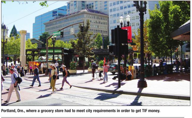 Given the choice, Safeway builds the same standard-issue suburban store regardless of where it is. It did not build a cookie-cutter store at this particular site in Portland because it wasn’t allowed to. The complex was part of a larger neighborhood revitalization pushed by the Portland Development Commission, the city’s economic development and urban renewal agency which also administers the city’s TIF programs. As such, the PDC does not merely approve private developments, it sets the parameters within which developers may work as a condition of their getting TIF money. The object is to shape projects so they add to their neighborhoods and not only to the city’s tax roll, and in this case that meant no suburbanstyle market in greater downtown Portland.
