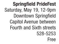This is your day to come out and show your respect and support with other tolerant and loving folks at Springfield PrideFest, May 19, downtown Springfield. Organized by The Phoenix Center, the party takes place on Capitol Avenue between Fourth and Sixth. The lesbian, gay, bisexual and transgender community celebration promises to make you laugh and feel the love. Highlights include a 6 p.m. show by nationally known comedian Suzanne Westenhoefer, St. Louis dance group AntiGravity at 3 p.m. and 7:40 p.m., Carla Sloan at 3:30 p.m., Ben Bedford at 12:15 p.m., and performances at 6:50 p.m. by the entertaining Springfield Drag Race winners. A children’s area is open until 7 p.m. Make sure to stop and share your personal story at the booth where they are working on a video project to show the gay community’s diversity and unity. Also, don’t miss Connections LGBT Film Series at the Legacy Theatre, May 17-20. For more details on PrideFest or the film series visit www.springfieldpride.org or atthelegacy.com.