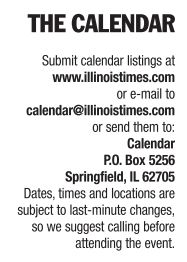 Springfield Area Highland Games & Celtic Festival May 19, 9am-7pm, Celtic-themed dance, music, food, storytelling, animal exhibits and more. $5, $3 kids 6-17. central-illinois-celts.org. Chatham Community Park, S. Main St, Chatham, 971-5893.