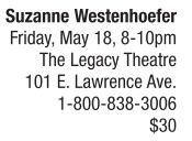 Nationally-known comedian Suzanne Westenhoefer performs at The Legacy Theater on Friday, May 18. With appearances on Letterman, HBO, Bravo, Logo, GSN and across the United States, the popular lesbian comedian was the first openly gay comedian to appear on television. Suzanne has new material thanks to several changes in her life, and she quips, “Even if you saw me last year, you’ll want to come back because there’s some crazy, fresh, new content that will knock your socks off. Expect 75-90 minutes of non-stop inappropriate comedy!” You won’t want to miss this “Jilted Gypsy -- For Sale or Rent.” VIP tickets that grant you admission to a meet-and-greet party are available for $50 by phoning 217-528-5253. Advance tickets are $25 from www.atthelegacy.com or by phone, 1-800-838-3006.
