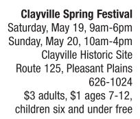 FESTIVAL | Pioneering the past Clayville Spring Festival is May 19-20 at the Clayville Historic Site, just east of Pleasant Plains on Route 125, and not far outside of town following Jefferson Ave. west. The old stage coach stop village comes alive with pioneer artisan and craftsman demonstrations, historic building tours, pony rides, pioneer crafts and games for kids, 40 craft vendors and local musicians. See the 10th Illinois Volunteer Calvary Regiment Civil War encampment, cowboy shows, Ollie DePriest - puppeteer, and Chris Camp The Whip Guy. Admission helps the Pleasant Plains Historical Society in its mission to restore the Broadwell Inn Stagecoach House and site. The website address is clayville.org. See also