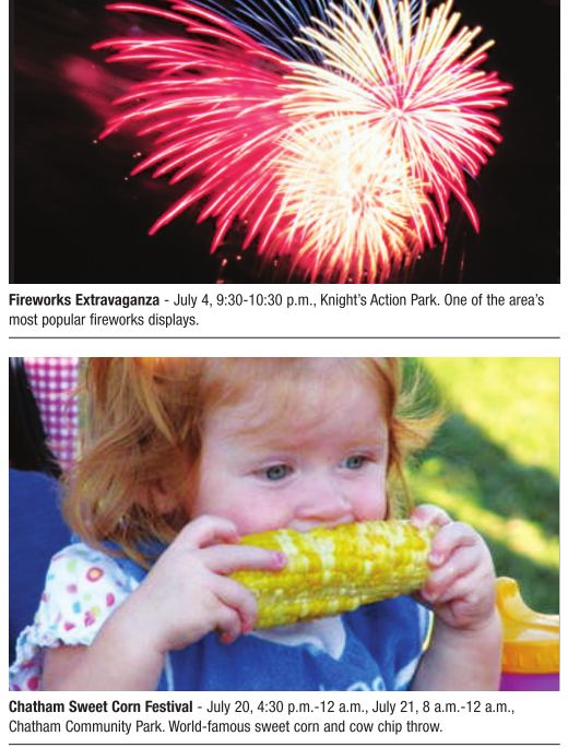 Chatham Sweet Corn Festival Jul 20-21, 4:30pm-12am Fri, 8am-12am Sat, Features world famous sweet corn and cow chip throw, plus entertainment and more. chathamjaycees.net. Chatham Community Park, S. Main St. The Lighter Side of Springfield History Jul 20-22, 27-29, Comedy about funny events and people from Springfield’s past, written by Tara McClellan McAndrew. Hoogland Center for the Arts, 420 S. Sixth St. 523-2787.