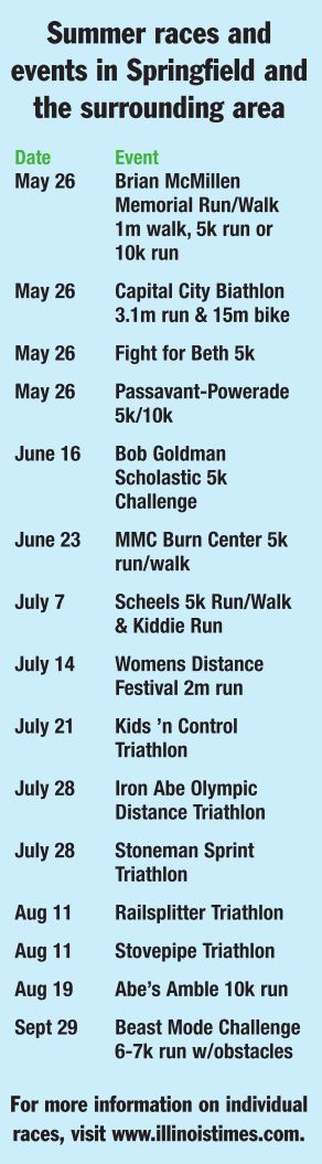 Coming up immediately are two separate events on the same day less than a mile apart. The Capital City Biathlon features a 5k run and a 15-mile bike ride, starting at 7:30 a.m. on May 26 at the Lake Springfield Beach House. Visit www.capitalcitybiathlon.com for more information. Just a half-hour later at 8 a.m. on May 26 is the Fifth Annual Brian McMillen Memorial Run/Walk, which offers a one-mile walk, 5k run or 10k run at Lincoln Land Community College. The event benefits the LLCC Brian McMillen Veterans Scholarship and other causes. For more information, visit www.llccveteransclub.org.