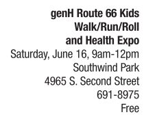 CHILDREN | Fit for a kid Looking for an activity for your younger ones this weekend? Put on those sneakers and join generation Healthy (genH) Coalition, The Parent Place, American Cancer Society, St. John’s Children’s Hospital and Kohl’s Cares for Kids at the Route 66 Kids Walk/Run/Roll and Health Expo. The free program at the Hope Picnic Shelter, Southwind Park, makes every kid a winner. Children 12 and under will be led through a variety of exercises to stretch and relax before the race where parents or an older sibling accompanies the child. There’s also healthy snacks, nutrition and physical activity info, a bounce house, obstacle course and more. Register at www.genhkids.org to guarantee a medal and T-shirt for your child, or at 9 a.m. For those who want to help others in the community, bring new diapers for The Parent Place Diaper Pantry. See also