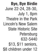 THEATER | Fun farewell Theatre in the Park at Kelso Hollow in Lincoln’s New Salem State Historic Site presents the comedic musical Bye, Bye Birdie. Sean VanAusdall-Rose directs this classic that opened on Broadway in 1960 featuring a story based loosely on the media circus of Elvis Presley’s 1958 Germany departure that had him giving one last kiss to a selected member of the Women’s Army Corps. In Bye, Bye Birdie, a soon to depart for the Army rock and roll singer visits the small town of one lucky Ohio girl selected to be sung a farewell song on the Ed Sullivan Show. Free pre-shows begin at 7 p.m. at the indoor theater. Make show reservations by phone between the hours of 11 a.m. and 5 p.m. Also, if you’re in downtown Springfield June 26, the TIP Bye, Bye Birdie cast performs from noon to 1 p.m. as part of Springfield Area Arts Council’s Artist on the Plaza series. See also