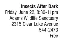 NATURE | Bug out Friday evening, grab your night walking clothes, bug spray, flashlight and camera (if you are a night photographer) and head out to Adams Wildlife Sanctuary for an interesting program titled, Insects After Dark. Several local entomologists help the group attract and identify insects using a system of lights and screens at a woodland, prairie and wetland location on the grounds. Arrive at 8:30 p.m. when you can view Jim Wiker’s collection of specimens and sign in for the excursion. Vern LaGesse leads the group out into the night at 9 p.m. Volunteers will be on hand to escort participants back to the parking lot if needed. We think you’ll stay to the end and leave metaphorically itching for more.