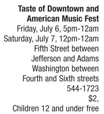 FESTIVAL | Capital cuisine Downtown sizzles the weekend after the Fourth of July and not just from the heat. The popular twoday festival, Taste of Downtown, runs Friday and Saturday, featuring the cuisine of over 20 city restaurants. Bite into scrumptious jerk pork tacos, meatloaf cupcakes, blackened salmon sliders, Caitie Girl’s horseshoe tributes, Cannolis, turkey cranberry cream cheese pretzel sliders, fried oyster po’ boys, New England crab rolls, grilled marlin burgers and more from your favorite restaurants including: American Harvest Eatery, Augie’s Front Burner, Bentoh’s, Brickhouse Downtown, Café Brio, Café Moxo, Coliseum Corner, Del’s Popcorn Shop, Gian Franco’s Italian Restaurant & Deli, Head West Sub Stop, Holy Land Diner, Hot Dog Pusher, Lake Pointe Grill, Maldaner’s Restaurant, Nick & Nino’s Penthouse Steakhouse, Porter & Hazel’s Delicatessen, Robert’s Seafood, Sebastian’s Hideout, The Butternut Hut and Z Bistro. Food and beverage tickets are $1. An admission wristband is required to buy food and drinks. Taste is a Downtown Springfield, Inc., event in association with the American Music Show. More info is at downtownspringfield.org.