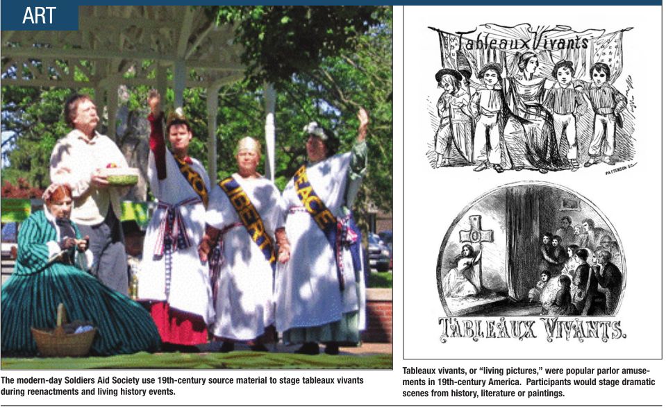 Twenty-first century Springfield citizens can still enjoy tableaux vivants, thanks to the modern incarnation of the Soldiers’ Aid Society, attached to the 114th Illinois Volunteer Infantry (Reactivated). Using 19th-century source material, the SAS stages their “living pictures” during reenactment and living history events. Their next performance of a tableau vivant will be at the Civil War Ice Cream Social at the Springfield Art Association on Saturday, July 14. Performance times will be at approximately 2 and 2:30 pm. The public is invited to enjoy the tableaux, free ice cream and Civil War dancing by the Springfield International Folk Dancers at this family-friendly event.