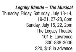 Roxy Theatricals presents nine performances of the Legally Blonde – The Musical. Based on the popular movie with Reese Witherspoon, college sweetheart and homecoming queen Elle Woods, played by Springfield’s Katie Ford, doesn’t take no for an answer. So when her boyfriend dumps her for someone serious, Elle puts down the shopping bags, hits the books, and heads for Harvard Law School. Owen Beans of Greenville plays Emmett. Directed by Greg Donathan. Sponsored by Davis Law Offices and Appearances Salon. Tickets can be purchased by phone or visit atthelegacy.com.