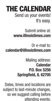 Arts and Music Festival Aug 05, 3-10pm, Live music, local artists and free food all to benefit Special Olympics of Springfield. Children’s activities 3-6 p.m. Crows Mill Pub, 1220 Toronto Road, 217-529-2769 .