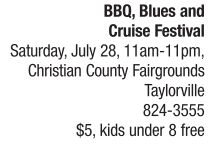 FESTIVAL | Finger-licking good Taylorville Main Street, Inc. presents another great day packed with activities, music, cars and food at its BBQ, Blues and Cruise Festival on Saturday, July 28. The day kicks off with a 5k Run/Walk, after which festival gates open at 11 a.m. “Bumble Bee” Bob Kamoske, Debbie Ross Band and the Screamin’ Vatos bring on the blues. Admission is $5. Parking is free. Additional fees are charged for laser tag and bouncy village. See also