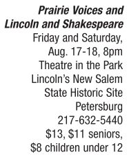 Kevin Purcell directs and stars, along side local acting sensation Aasne Vigesaa, in Prairie Voices, a performance of poems and songs that celebrate the beauty of the Illinois prairie. Poems by Edgar Lee Masters, Vachel Lindsay and Carl Sandburg are featured, along with music accompaniment by Deb Watts. Lincoln and Shakespeare is a theater piece, created and directed by Kevin Purcell that combines Lincolns’ words with scenes from several Shakespeare plays. The cast includes Aasne Vigesaa, Tom Lawton, Linda Schneider, Jonah Walker, August Roy, Joey Cruse and Fritz Klein. Don’t miss the 7:15 p.m. free pre-show. Also, bring at least two items for school children, and receive a free popcorn coupon for the show as Theatre in the Park teams with the Petersburg Chamber of Commerce.