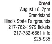MUSIC | Power foursomes Platinum-selling Vancouver four-man rock band Theory of a Deadman and Las Vegas quartet Adelitas Way open for rock giants Creed, Thursday, Aug. 16 at the Illinois State Fair Grandstand. Creed’s original lineup of Scott Stapp (vocals), Mark Tremonti (guitar), Brian Marshall (bass) and Scott Phillips (drums) take the stage in what promises to be a triple-amazing concert. Creed was voted Favorite Group in 2003 on the People’s Choice Awards and won numerous American Music Awards, Billboard Music Awards and others including the Grammy Award for best Rock Song in 2001 for “With Arms Wide Open.” See also