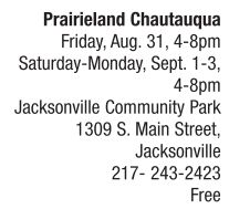 Aug. 31 through Sept. 3 is the 14th Annual Prairieland Chautauqua at the Community Park in Jacksonville. This year’s theme is “Women Who Made History.” Under the big tent will be presentations by reenactors, storytelling, lectures, music, dance and nightly communal suppers. The four-day event features Ben Bedford, Brian Fox Ellis, Betty Carlson Kay, Debra Connor, Chris Everett, Kathryn Harris, Karen Vuranch, The Capital Chamber Singers, Sherri Mitchell, Leslie Goddard, Terri Benz, Loretta Widdows and The Gospel Gals. Sponsors are The Morgan Country Historical Society and the Illinois Humanities Council.