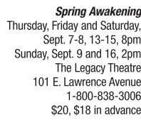 The musical Spring Awakening breaks out on the stage at The Legacy Theatre this weekend and next, Sept. 7-9 and 13-16. Winner of eight Tony Awards, Spring Awakening is full of pent up passions and rebellious sensibilities of a group of late nineteenth-century students trekking their way from adolescence to adulthood. And all that fervor is expressed through rock and roll in what Entertainment Weekly called, “The most gorgeous Broadway score this decade.” Presented by Roxy Theatricals and directed by Jason Gross, the production contains mature language and themes, so parental discretion is advised. Tickets may be purchased online or by phone. Visit atthelegacy.com.