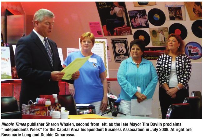 Sharon, I should explain, was the publisher of Illinois Times for a decade that ended last week. She’s good at the work. Her association with the paper’s business operations goes back to 1980, and in that time those operations have grown gratifyingly more sophisticated. However, it was as “a journalist’s publisher” that our editor rightly praised her in his announcement of Sharon’s leaving. It might be interesting if I were to recall for you the many conversations I’ve had with Sharon after I’d annoyed in print an advertiser or influential reader, conversations in which Sharon asked me ever so politely whether I might maybe back off of this businessman or say something nice about that project, you know, for the sake of the paper. Only I can’t. She never asked me. Not once.