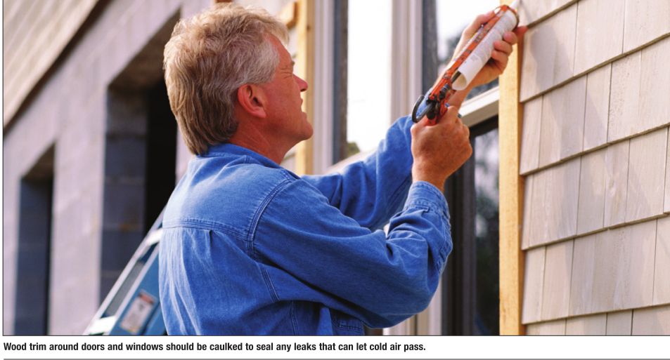 The wood trim around doors and windows should be caulked to seal any leaks between the trim and drywall that can let cold air pass. Cracks in the foundation should be caulked as well, along with the joint between house and foundation.