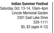FESTIVAL | Autumn ambience Springfield’s long love affair with the Indian Summer Festival continues this weekend, Oct. 13 and 14. Two fun-filled days are planned, and it is certain that all ages will once again flock to the fields and forest at Lincoln Memorial Garden for mouthwatering food, autumn ambience, loads of music and enjoyable activities such as pumpkin painting, games, face painting and balloon sculptures. Back is the wildly popular fairy house building activity. Pictured is volunteer fairy Aimee Daniels. Bring your wallet and mingle among craft vendors and artists selling their wares. Bring your walking shoes. Bring your thirst for an enjoyable time. Nothing welcomes in fall to Springfield like the Indian Summer Festival and time spent at the garden when the foliage changes color. See also