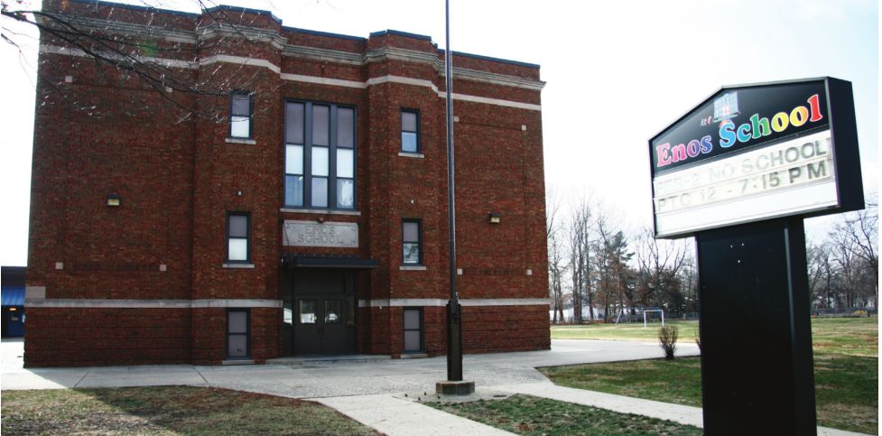 The district’s plan calls for demolishing Enos School, which the Illinois Historic Preservation Agency says is eligible for inclusion in the National Register of Historic Places. Earlier this year, Landmarks Illinois, a statewide architectural preservation organization, listed Enos School as one of the most endangered historic schools in the state.