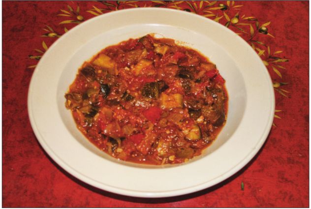 Rinse the eggplant cubes thoroughly and roll them in a lint free towel. Squeeze the towel to remove as much moisture as possible. Return the skillet to high heat, add another tablespoon of oil. When hot, add the eggplant and stir-fry until softened and lightly caramelized. Add to the pot. Return the skillet to the heat, add a tablespoon of olive oil, repeat the process with the peppers, then add to the pot. Repeat with the zucchini, but after stirfrying, set it aside; DO NOT add to the pot.