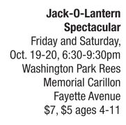 HOLIDAY | Pumpkin party Rain or shine, meander through the Halloween splendor of 2,012 hand-carved, illuminated jack-olanterns surrounding the Carillon and Botanical Garden in Washington Park. This family-friendly event is a fundraiser for the Rees Carillon. Save $1 per ticket in advance at all Pease’s stores and Bank of Springfield locations. Food vendors will be on location. Organizers suggest taking a free shuttle to avoid the parking congestion at the park. The shuttle will be located in the Hobby Lobby parking lot, Chatham Road and Wabash Ave.