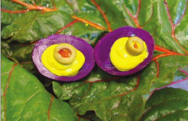 Place the dyed egg white halves cut side up on a platter large enough to hold them comfortably in one layer. Fill the cavities with the yolk mixture using a portion scoop, two spoons, or a pastry bag fitted with a plain tip.