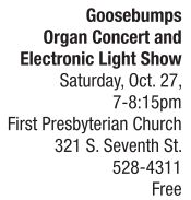 HOLIDAY | Awe-inspiring tribute Organ music and electronic lighting that are dramatic, evocative and perhaps a little eerie, accompanied by expressive dance, work together to commemorate All Saints’ Day. Award-winning organist Christopher Holman performs Bach’s “Toccata and Fugue in D Minor,” Andrew Lloyd Webber’s “Phantom of the Opera Overture” and pieces by composers Widor and Gounod, among others. Organizers welcome attendees to add to the ambience of the evening by dressing in all black or all white or as a hero from the past, though no one is required to do so to attend the show. Light refreshments follow. Donations will be accepted for the Salvation Army. More information on the concert and parking are online at first-pres-church.org. See also