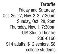 THEATER | Comedy of heir-ors Tartuffe opens at University of Illinois Springfield Studio Theater Oct. 26 igniting the 2012-2013 season for the UIS theater department. Six performances showcase this comedy by Moliere, twice banned in the 17th century as sacrilegious, and brought to light in a contemporary translation by Ranjit Bolt. Subtitled, “The Hypocrite,” the play focuses on a religious fraud, Tartuffe, who slyly dupes a wealthy merchant, Orgon, into signing over to him his estate, and even his daughter. UIS Associate Professor of Theatre Missy Thibodeaux-Thompson directs. Buy tickets in person at Sangamon Auditorium ticket office to avoid a higher service charge. More details on the play can be found at www.uis.edu/theatre. See also