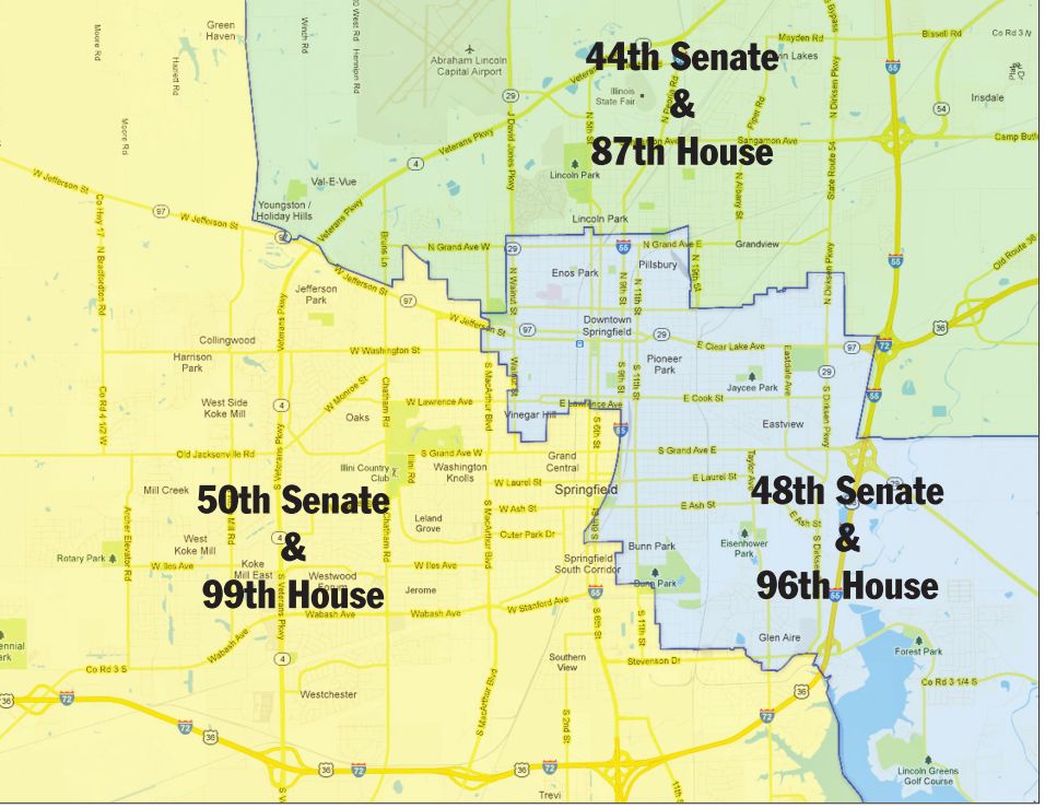 The new map splits Springfield into three Senate districts, each of which contains one House district covering Springfield and a separate House district outside Springfield.
