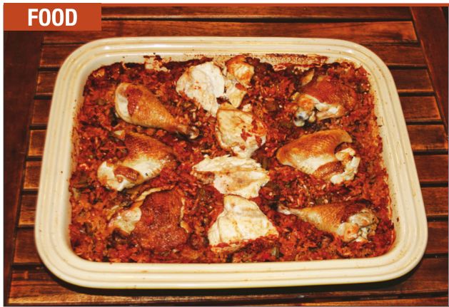 Bring the stock to a boil in a saucepan and set aside. Arrange the chicken pieces over the rice, placing the legs and thighs around the edges and the breast pieces in the center. Add any pan juices from the bowl.
