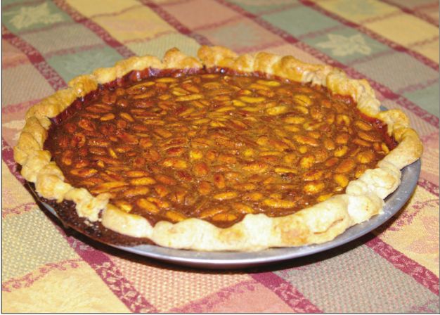 • 1 c. skinless, roasted, salted peanuts Preheat the oven to 350° F. Combine all ingredients except the peanuts and blend or whisk until completely incorporated. Stir in the peanuts and pour into a partially baked 9-inch pie shell (preferably made with sesame seeds). Bake 45-55 minutes or until set.