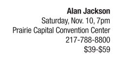 Country music superstar Alan Jackson takes the Prairie Capital Convention Center stage this Saturday, Nov. 10. Admired for decades for his classic country sound and hunk-ofburning-lovely looks, Jackson has more than two dozen albums and numerous Grammy, Country Music Association and Academy of Country Music awards. His latest album, Thirty Miles West, debuted at the top of Billboard’s top country album sales chart, making this his 13th album to debut in the No. 1 spot on release week. Special guests joining Jackson are American Idol third-place finalist hunk Casey James and dark horse David Nail.