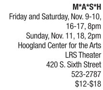 THEATER | Marvelously mischievous Springfield Theatre Centre presents its rendition of M*A*S*H at the Hoogland Center for the Arts Nov. 9-11 and 16-18. Produced by Jim Leach and directed by Kelly E. Bassett, the crazy comedy brings you your favorite silly surgeons Hawkeye and Duke serving in South Korea. In this production, the pair wages a campaign to get a young Korean to the U.S. and entered in a good school which sets the stage for various hilarious incidents. A preshow dinner served by Arena Food Service is planned for opening night, Friday, Nov. 9, at 6:30 p.m. Phone for reservations. See also