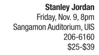 Guitar guru Stanley Jordan performs Nov. 9 at the Studio Theatre as part of the Kitchen Sink Series at the University of Illinois Springfield. The Chicago native and jazz fusion guitarist began studying music early in his childhood and received a Bachelor of Arts in digital music composition from Princeton University. Nominated for multiple Grammy Awards and a NAACP Image Award, Stanley has performed in nearly 50 countries, made multiple appearances on “Late Night With David Letterman” and “The Tonight Show” was featured in Bruce Willis’ film Blind Date and has played with the likes of Dizzy Gillespie, Quincy Jones, Michael Urbaniak and Richie Cole. Jordan has released 13 solo albums, the latest one titled Friends. Learn from the pro who offers two workshops for musicians Nov. 10 at 2 p.m. and 7 p.m. Attendees must register at Jordan’s website. The cost is $80.