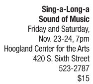 FILM | Interactive showing Warm up your vocal chords, cut up those chintz curtains and parade, bike or skip on down to the Hoogland Center for the Arts for the Sing-a-Long-a Sound of Music. On Nov. 23 and 24, watch the classic film on the big screen and interact with the movie under the direction of Johnny Molson, morning cohost on ALICE-FM. This is a huge audience participation event with subtitles for all songs. Molson will lead attendees through a vocal warmup and provide a comprehensive guide to the accompanying actions and use of an interactive fun pack. Dress up in your favorite Sound of Music costume and join the parade. Having started in the U.K. in 1999, the Sing-a-Long-a Sound of Music show has become a worldwide hit, playing to packed houses across the globe with more than 10,000 performances in 11 countries. See also