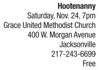 Lincoln Land Community College presents Hootenanny with Ken Bradbury, Barry Cloyd and friends. This is a free and fun evening of music and sing-a-longs to benefit the Jacksonville Area Community Food Center. In lieu of an admission charge, bring nonperishable food items or a monetary donation. All money and goods received go to this great cause. Bradbury is a local musician, composer and playwright. Barry Cloyd is a Midwestern-based singer/songwriter.
