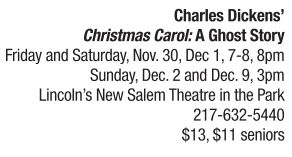 Lincoln Land Community College presents a mystical production of the classic holiday tale. With a cast of 20 performing almost 60 roles, a flying bed, sound effects and a beautiful underscore, you’ll enjoy the original Dickens story with a little something added to emphasize the ghost story in the play. Produced in association with Theatre in the Park and the Lincoln League of New Salem, tickets can be purchased three hours before curtain time or via phone. Leave a message and staff will return your call.
