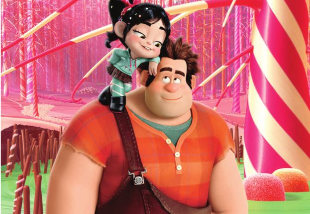 After a disastrous stop over in a firstperson shooter military game, he winds up in a car-racing extravaganza called “Sugar Rush,” a Candy Land/Nascar nightmare of rainbow colored autos and garishly painted backgrounds that you’re likely to develop diabetes from if you stare at it too long. There he meets Vanellope von Schweetz (Sarah Silverman), a grating young lady who insists Ralph help her get in the derby that’s about to be run. Unfortunately, she’s a glitch – a programming mistake – which causes her to be a pariah amongst the other brightly colored and equally irritating racers.
