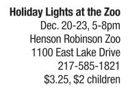 Looking for that last-minute holiday activity to share with the family? The Springfield Park District’s Henson Robinson Zoo has been featuring its 17th annual Holiday Lights at the Zoo in December. There’s still time this weekend to take the walking tour to see thousands of lights and light displays. You also get to see Santa Claus as he makes a special appearance each night. In addition, the gift shop is open for any last-minute holiday shopping you may have and free hot chocolate will be served. Bring a new, unwrapped toy for Toys for Tots and you will be admitted free of charge. The zoo’s website is hensonrobinsonzoo.org.