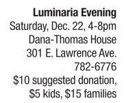 One of Springfield’s most beloved sites at Christmastime is the Dana-Thomas House State Historic Site on Luminaria Evening, set for Saturday, Dec. 22, from 4-8 p.m. Approximately 1,000 luminaria will shine along the sidewalks and ledges of the 12,600 square-foot structure. Tours are offered by the inviting light of decorated Christmas trees and warm, glowing fireplaces. Tours are silent except for live music performed in the house. Recently retired DTH Decorative Coordinator Kathy Liesman decorated the Dana-Thomas House halls for the holidays. This will be her last year. The home will remain decorated throughout the New Year, with tours Wednesday through Sunday from 9 a.m. to 4 p.m. The site is closed Christmas Day and New Year’s Day. The Illinois Historic Preservation Agency sponsors Luminaria Evening.