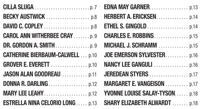 Remembering the lives they lived Celebrating 22 loved ones lost in 2012 About the issue Each year when we put together our end-ofyear obituary issue, I find myself wishing I had known these people, or known them better. I’d see Dr. Gordon Smith at community meetings, but never knew he was a stalwart of Union Baptist Church and conducted a prison ministry. Becky Austwick used to work at Illinois Times, but I didn’t realize the depth of her character until I read about it here. We all heard about the cyclist killed by a car on a roadside in Auburn, but how many knew Grover Everett was a supercyclist and an athlete who had been a skydiver, weight lifter, a runner and a swimmer? Attorney Mary Lee Leahy was well known for her success at the Supreme Court, but less well known for her sense of humor and Kentucky Derby parties. Here are tributes to 22 members of our community who died in 2012. They are but a small group from the hundreds who passed from the Springfield scene this year. There was no attempt to be comprehensive, only to illuminate a few of the rich lives that have come and gone. Illinois Times writers contributed the longer essays presented here, while the shorter tributes were submitted by readers. If the regret is that we didn’t know these people, a lesson may be to make more friends, and to get to know our friends better while they are here. Nancy Lee Ganguli, whose story is on p. 16, was all about making friends. “Authentically interested in others, she had no fear about reaching out to anyone.” She, like all the others, is an inspiration. –Fletcher Farrar, editor and publisher See also