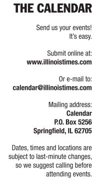 Sonnets from an Ungrafted Tree Dec 31, 5:30pm and 7pm, Free compelling original play based on sonnets by Edna St. Vincent Millay with actress Aasne Vigesaa. Reservations by phone. Vachel Lindsay Home State Historic Site, 603 S. Fifth St, 217-524-0901.