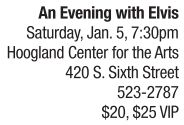 MUSIC | Royally rockin’ Celebrate the King of Rock ’n’ Roll’s 78th birthday with two nationally known performers Elvis Himselvis, aka Rick Dunham, and Steve Brandes and The Elvis Himselvis Band at the Hoogland Center for the Arts on Jan. 5. The tribute concert is a fundraising show for the Mary Bryant Home for the Blind and Visually Impaired, located in Springfield. Tickets are $20 for general admission, with a limited number of VIP tickets available. Visit the Hoogland website or phone to reserve your seat. The Mary Bryant Home also has tickets at 1-888-529-1611. See also