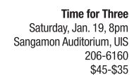 The category-shattering string trio, Time for Three, plays at Sangamon Auditorium, UIS on Saturday, Jan. 19. Members Zachary De Pue, violin; Nicolas Kendall, violin; and Ranaan Meyer, double bass, carry a passion for improvisation, composing and arranging, all prime elements of the ensemble’s playing with a reputation for limitless enthusiasm and no musical boundaries. For a preview, check out the moving video that features the amazing sound of Time for Three on the group’s website tf3.com.