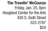 MUSIC | Foot-stompin’ bluegrass The Travelin’ McCourys bring their amazing pickin’ and foot-stompin’ bluegrass sounds to the Hoogland Center for the Arts. The group springs from the award-winning bluegrass Del McCoury Band. Legendary Del McCoury was Ronnie’s (mandolin) and Rob’s (banjo) father. Rounding out the four-member ensemble is fiddler Jason Carter and bassist Alan Bartram. The group has played with the likes of the Allman Brothers, Lee Boys and Warren Haynes. This is another fine WUIS Route 66 Bedrock Live concert. Chicago’s young and impressive Henhouse Prowlers open the show. See also