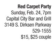 TELEVISION | Oscar coverage The party not to miss this weekend is the Central Illinois Film Commission’s Red Carpet Party at Capital City Bar and Grill during Oscar night, Feb. 24. Hollywood comes to Springfield. Walk the red carpet like a star, watch the Oscars unfold before you on the big screen, and meet cast and crew from the film Lincoln. There will also be a display of props and uniforms from the nominated film, including the saddle Daniel Day-Lewis rode. Dress in your black-tie best, your street clothes or as your favorite movie character. The best movie character will win a prize. All partygoers can get photographed on the red carpet by Mike Unland. He’ll have a green screen to make it appear as if you really were at the west coast festivities. Tickets for the evening can be purchased at the door or by phone. See also