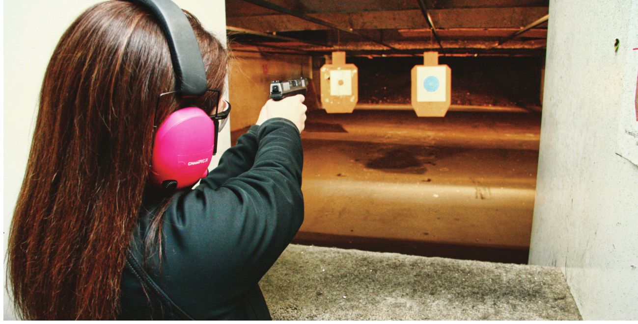 gunfire pierces the walls of the firing range and punctuates the chatter