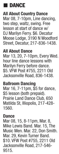 Poetry Open Mic Mar 20, 6-8pm, Bring poetry to read, or just sit back and listen. Springfi eld Poets & Writers. 725-9058. Robbie’s, 4 S. Old State Capitol Plaza, 217-528- 1901.