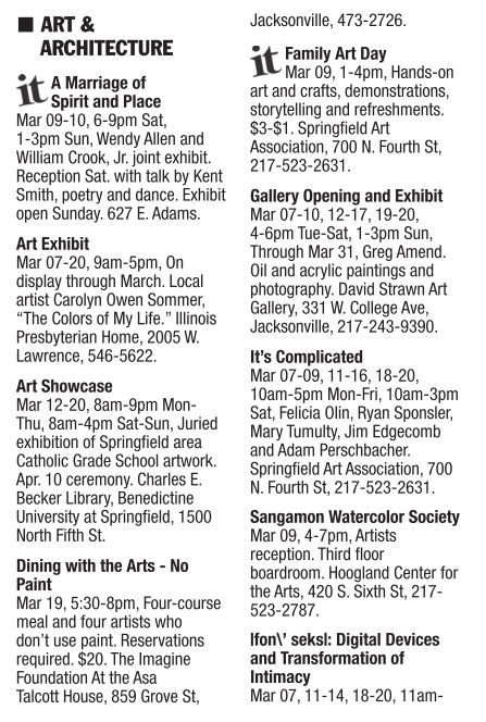 Poetry Out Loud - State Contest Mar 08, 1pm, Hear students compete who have memorized poetry. Hoogland Center for the Arts, 420 S. Sixth St, 217-523-2787.